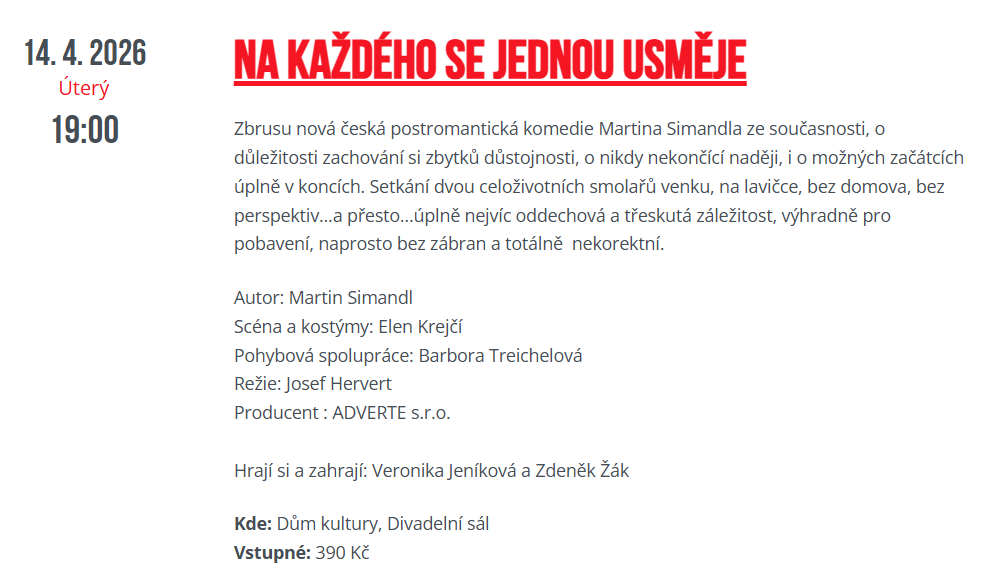 V úterý 14. dubna 2026 se v Kyjově koná v Domě kultury divadelní představení NA KAŽDÉHO SE JEDNOU USMĚJE. Cena vstupenky 390 Kč + doprava minibusem (do 100 Kč, upřesníme).